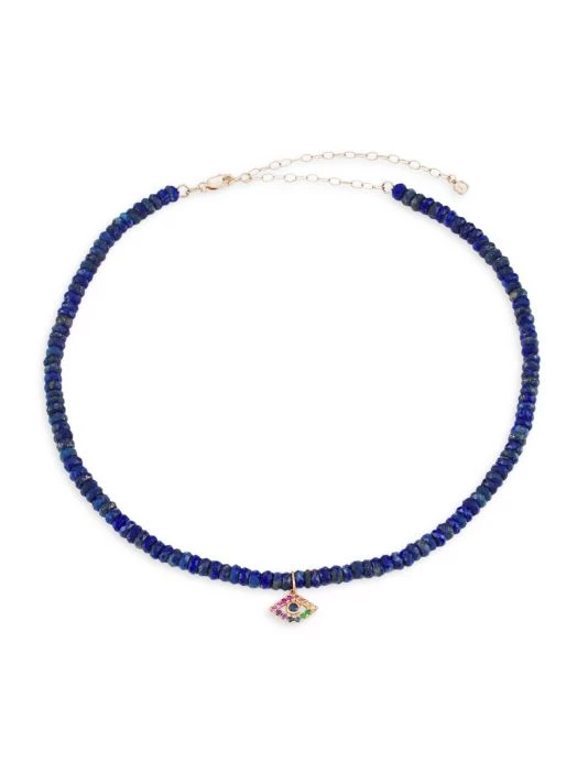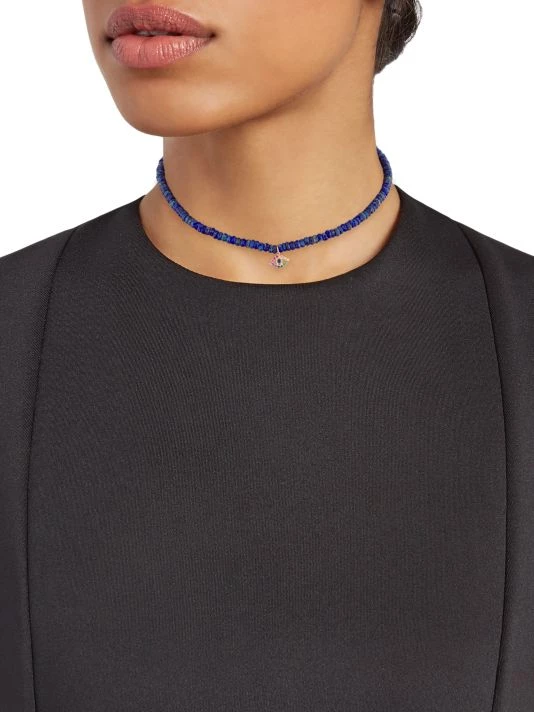 Multi-color stones come together to accent the evil wheel pendant of this 14K white gold choker necklace.