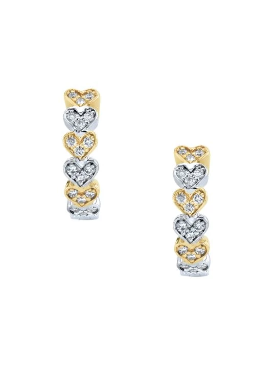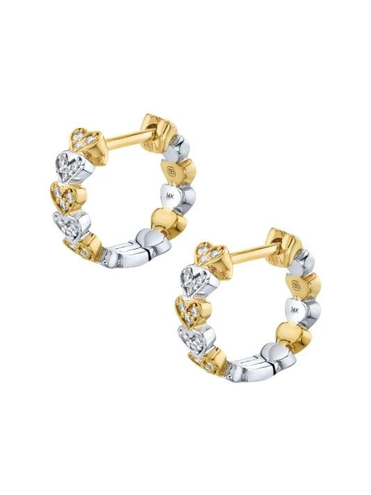 Delicate heart-link huggies shimmer in polished white and yellow gold with diamond pavé embellishment.