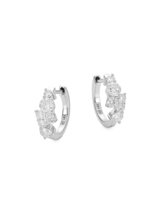 A polished pair of white gold huggie hoops featuring glittering diamonds.