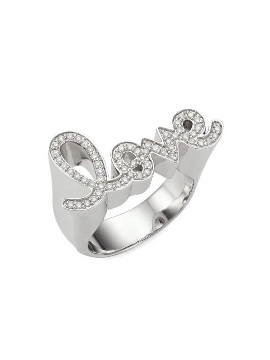 Sparkling diamonds amplify the glamour of this ring featuring “love” script letters.