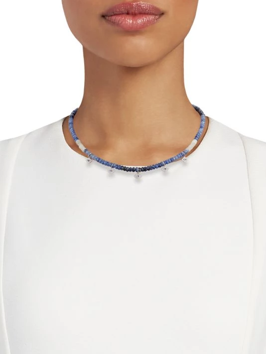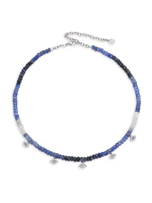 Thick blue shaded sapphire beaded necklace finished with delicate pavé diamond evil eye charms centered with a sapphire.