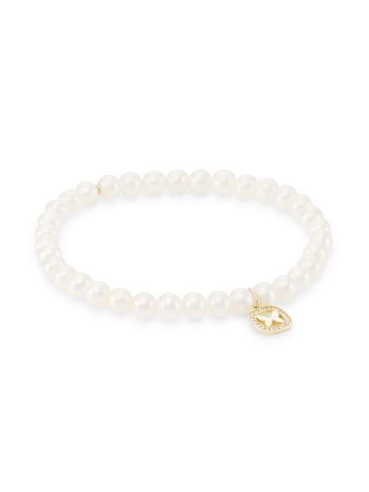 Composed of luminous white freshwater pearls, this elegant bracelet features a 14K yellow gold cutout butterfly charm set with sparkling pavé white diamonds.
