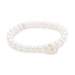 Composed of luminous white freshwater pearls, this elegant bracelet features a carved rainbow moonstone evil eye charm set in 14K yellow gold and accented with a sparkling center white diamond.
