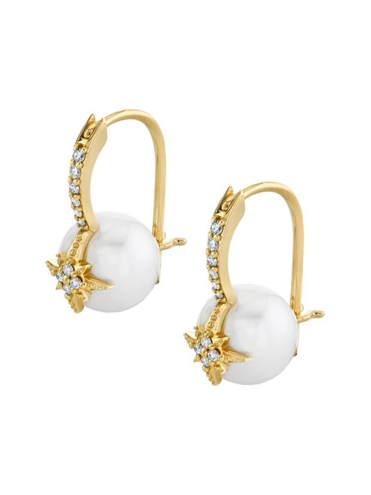 Delicate earrings feature a starburst motif set with sparking diamonds on a luminous pearl drop.