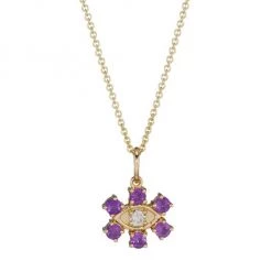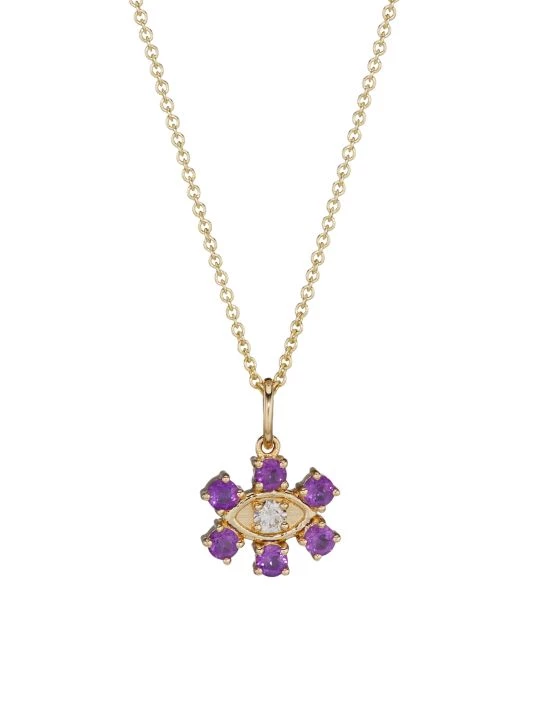 Crafted of 14K yellow gold, this elegant necklace features an evil eye pendant embellished with sparkling round amethysts and a center round white diamond.