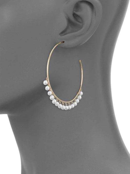 Lustrous white pearls dangle from these sleek 14K yellow gold hoops.