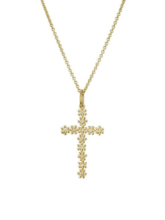 The classic cross necklace reinvented in a daisy design alit with 12 sparkling diamond on a beaded gold chain.
