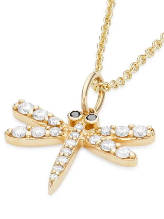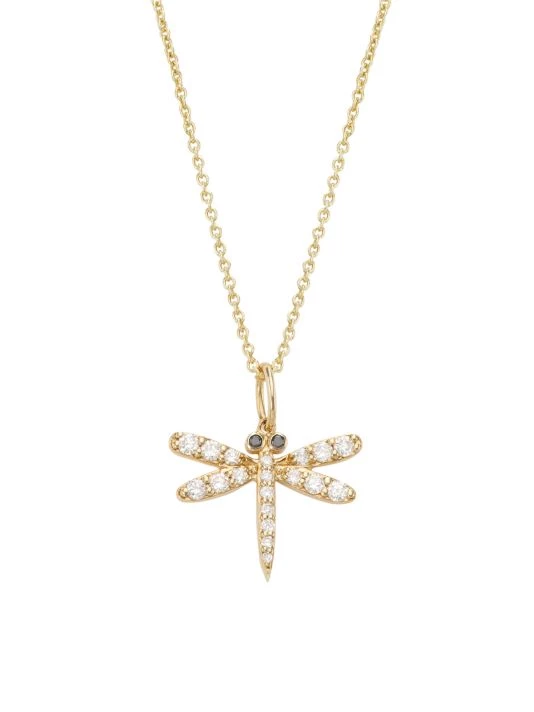 ONLY AT SAKS. Made of polished 14K yellow gold, Sydney Evan’s necklace features a whimsical dragonfly pendant suspended from a fine cable chain. This charming embellishment shimmers with round white and black diamonds.