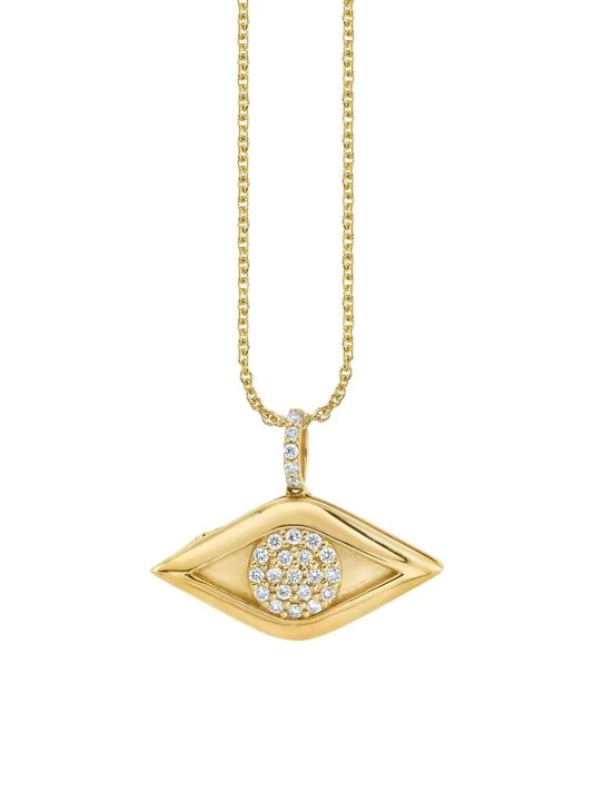 Polished evil eye locket charm with diamonds at the bale and pupil suspends from a delicate link chain.
