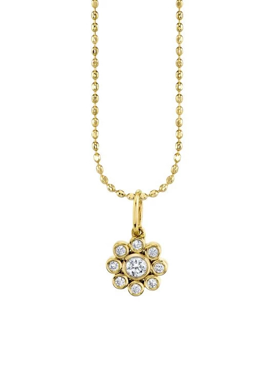 Nine brilliant-cut round diamonds form this sparkling flower pendant suspended from a beaded gold chain.