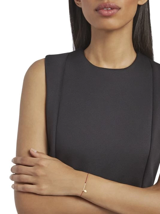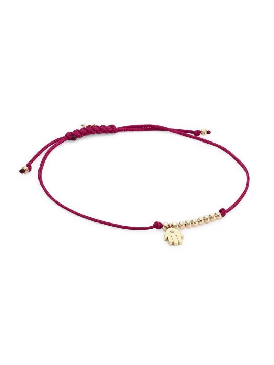 A delicate diamond-studded 14K gold hamsa charm adds sparkle to this garnet-color knotted cord bracelet accented with gold beads.