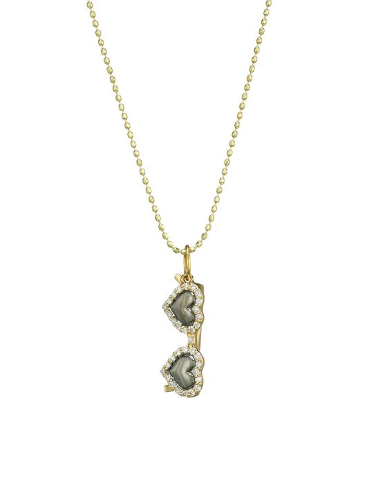 Chic yet playful heart-shaped sunglasses charm dazzles with diamonds on a beaded gold chain.