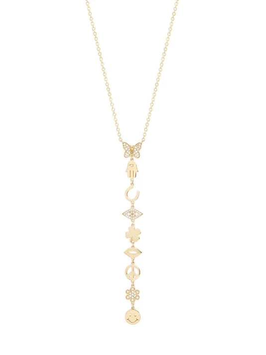 ONLY AT SAKS. Accented with shimmering white diamonds, Sydney Evan’s 14K-yellow-gold lariat necklace features a linear drop of nine charming icons. Brand founder Rosanne Karmes draws inspiration from spirituality and travel to create her line of whimsical, meaningful jewelry.