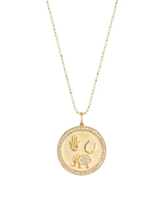 A delicate chain suspends a luminous gold coin charm adorned with a trio of images enhanced with pavé diamond details.
