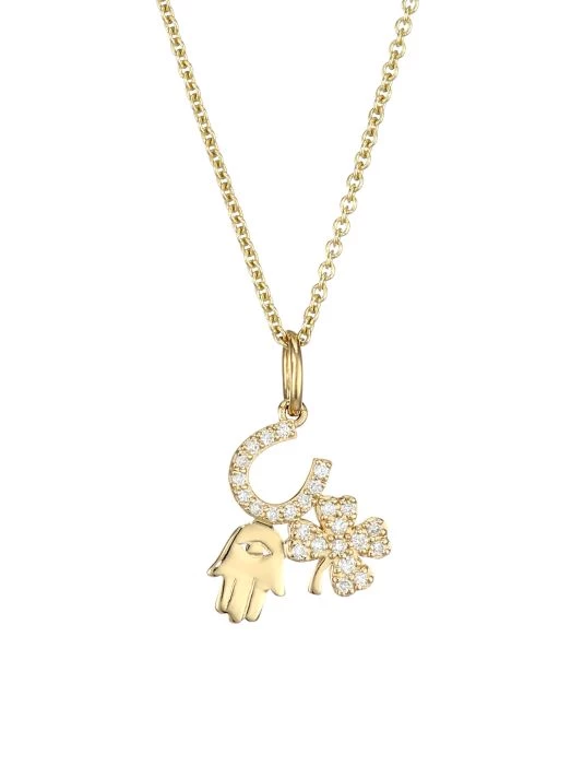 Diamond pavé accented charm showcasing three iconic luck and protection symbols on a golden chain.