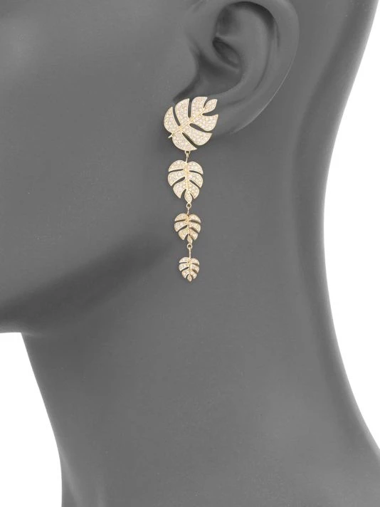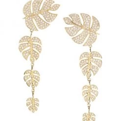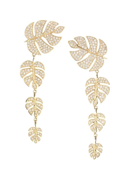 Exquisite cascading tropical leaf earrings set with diamonds sparkling across the entire surface of every sculptured leaf.