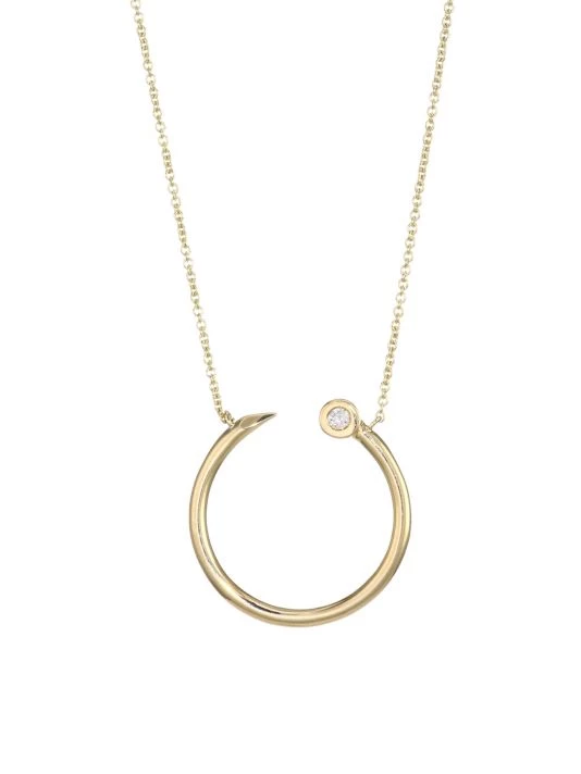 A golden nail pendant shaped like a horseshoe and featuring a diamond nail head is suspended from a fine link chain.