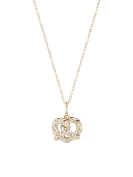 Crafted of polished 14K yellow gold, this necklace features a charming pretzel pendant adorned with sparkling brilliant-cut gypsy-set white diamonds.