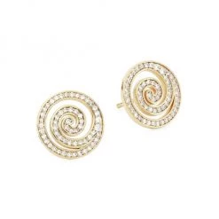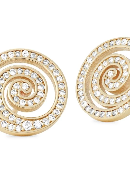Pavé-set with shimmering white diamonds, Sydney Evan’s spiral stud earrings are crafted of polished 14K yellow gold. This playful pair secures with a post back.