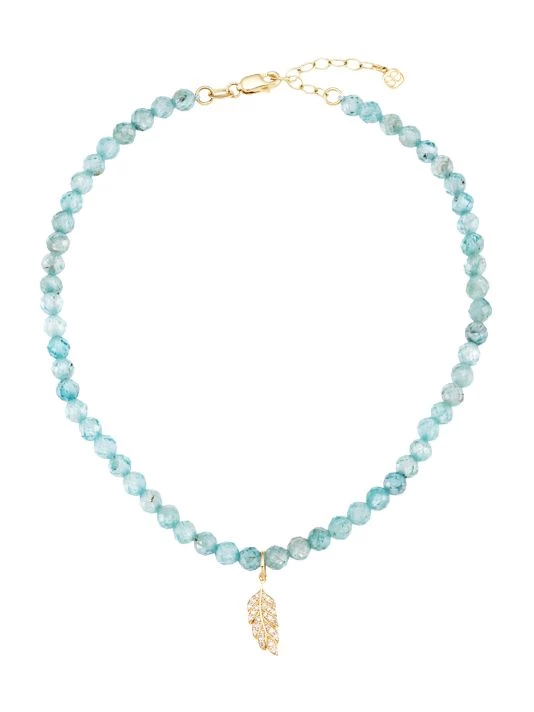 Polished yellow gold feather encrusted with glittering diamonds dangle from this beaded anklet.