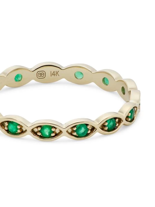 Made of 14K yellow gold, this eternity band sparkles with luxurious emeralds.