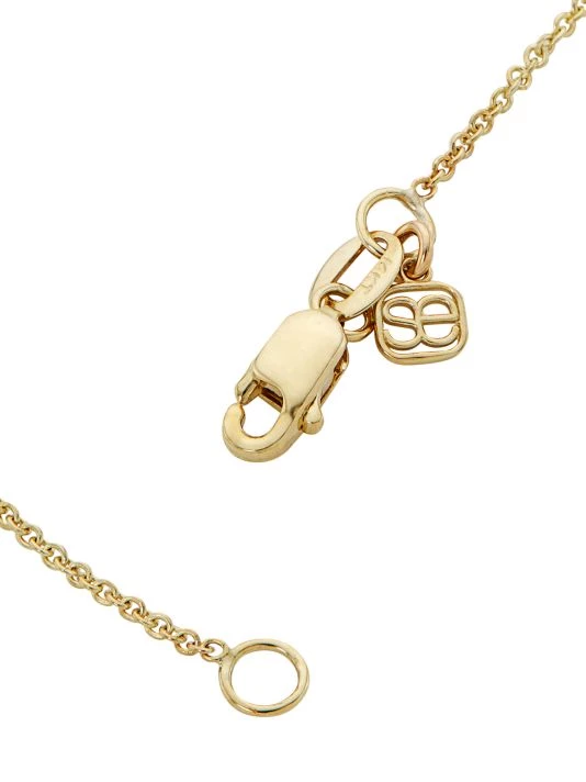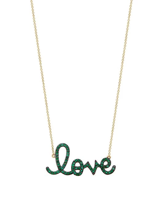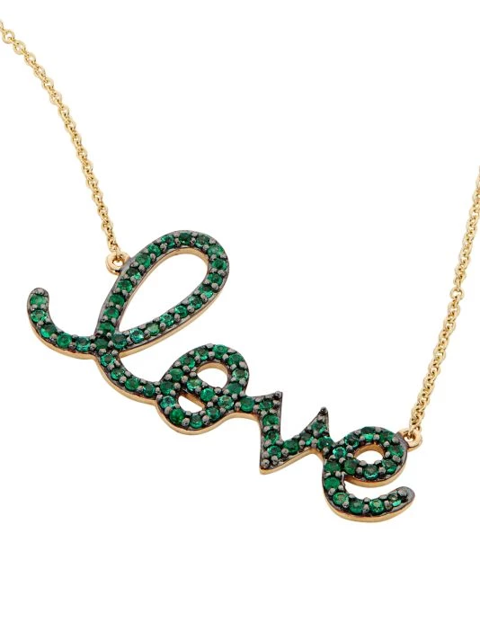 Crafted of 14K yellow gold, Sydney Evan’s necklace features a “Love” pendant embellished with shimmering pavé emeralds. These vibrant gemstones rest in blackened settings.