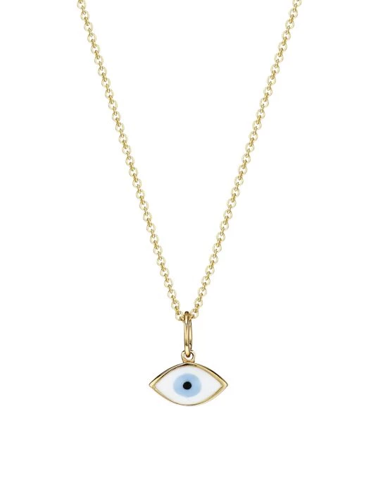 A delicate link chain crafted of glowing 14K yellow gold suspends an enamel evil eye pendant.
