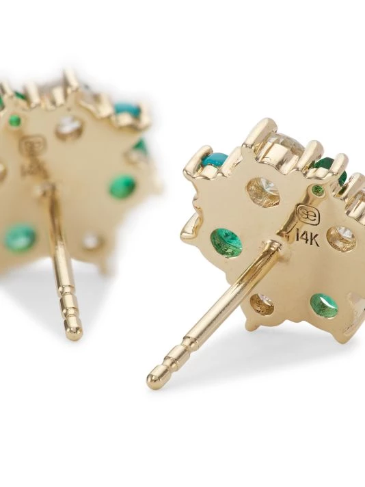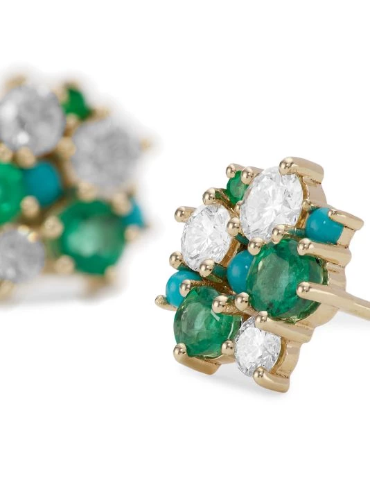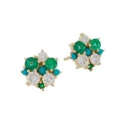 Crafted of 14K yellow gold, Sydney Evan’s stud earrings are embellished with clusters of round white diamonds, emeralds, and turquoise cabochons. This elegant pair is ideal for adding a subtle pop of color to any look.
