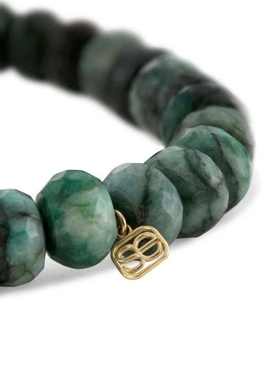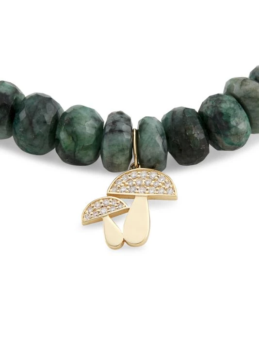 Composed of emerald rondelles strung on an elastic cord, this whimsical bracelet features a 14K yellow gold mushroom charm accented with sparkling white diamonds.