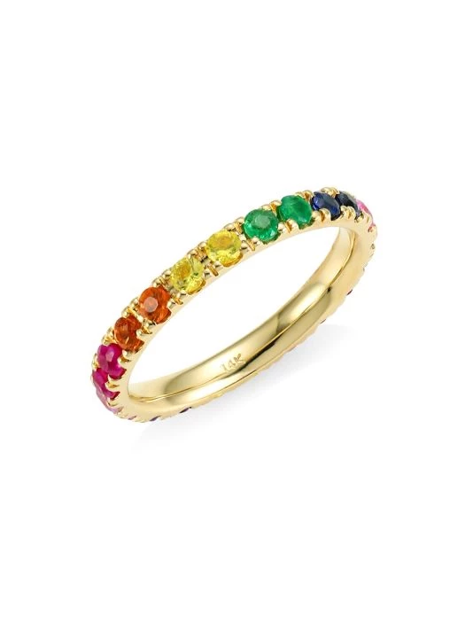 Adorn your finger with this elegant 14K yellow gold large eternity ring embellished with emerald, amethyst, ruby and multi-colored sapphire stone accents.