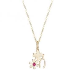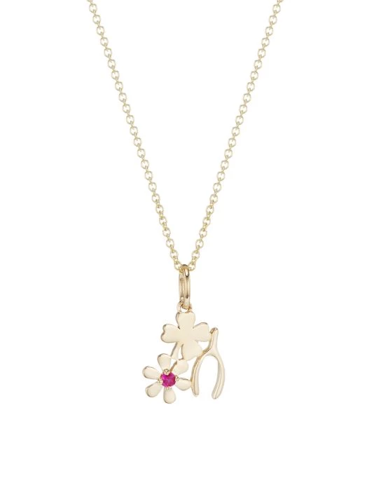 Made of polished 14K yellow gold, this whimsical necklace features a ruby-studded pendant sculpted into the shape of a four-leaf clover, flower and wishbone.