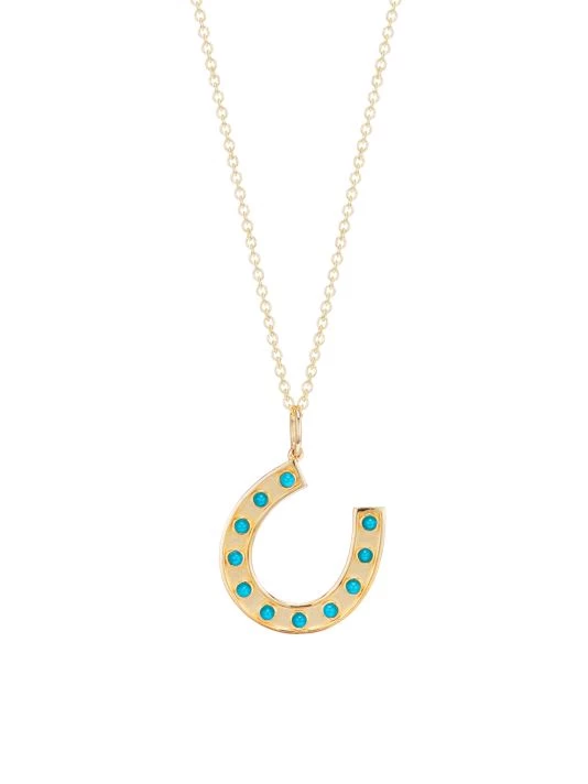 This chain link necklace features a horseshoe pendant with glistening turquoise.