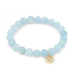Threaded with glossy aquamarine beads, Sydney Evan’s stretch bracelet is embellished with a whimsical 14K-yellow-gold spiral charm encrusted with shimmering white diamonds.