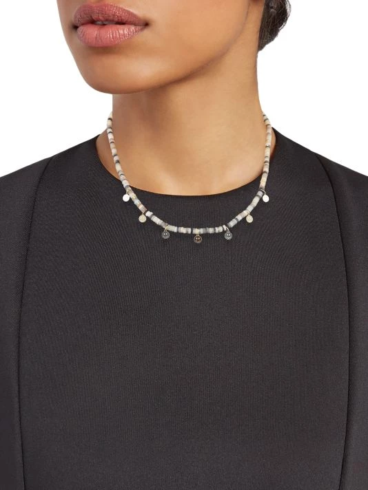 Composed of Australian opal heishi beads, this delightful necklace is adorned with 14K yellow gold and enamel smiley face charms.