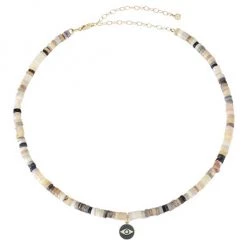 An enamel evil eye charm centers this beaded choker necklace featuring luminous grey opals.