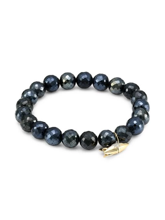 Lustrous faceted black spinel bead bracelet dangles a shiny yellow gold rocket charm embellished with a diamond-encrusted star.