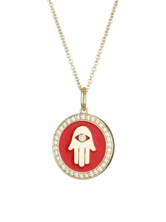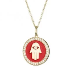 Embellished with a pavé trim, this circular pendant necklace features an eclectic hand illustration.
