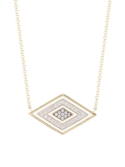 Composed of 14K yellow gold, this necklace features a whimsical evil eye pendant adorned with sparkling white diamonds and white enamel