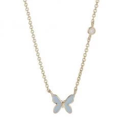 Accented with a petite round white diamond at the fine cable chain, this 14K yellow gold necklace features a whimsical butterfly pendant detailed with light blue enamel.
