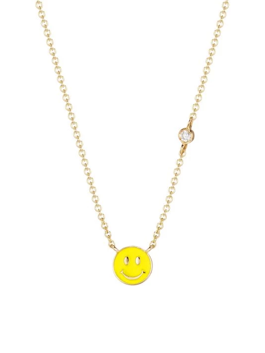 Featuring a charming yellow enamel smiley face pendant, this 14K yellow gold necklace is accented with a sparkling round bezel-set white diamond at the cable chain.