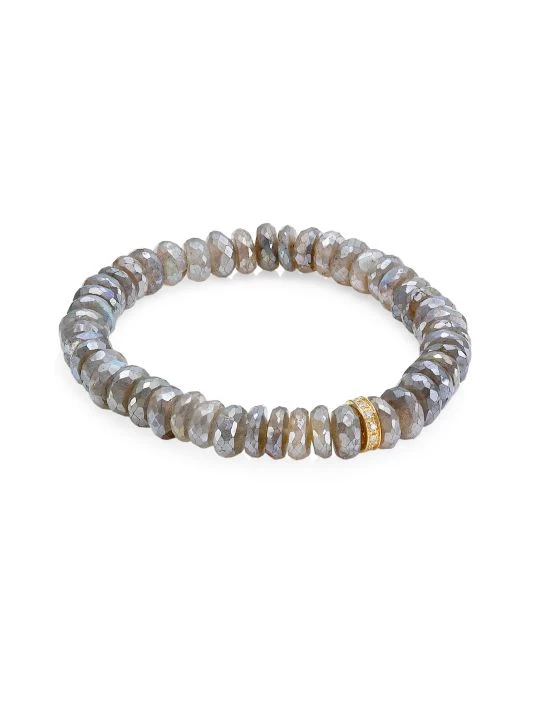 A faceted mystic labradorite beaded bracelet is adorned with a delicate 14K yellow gold rondelle bead dotted with shimmering diamonds.