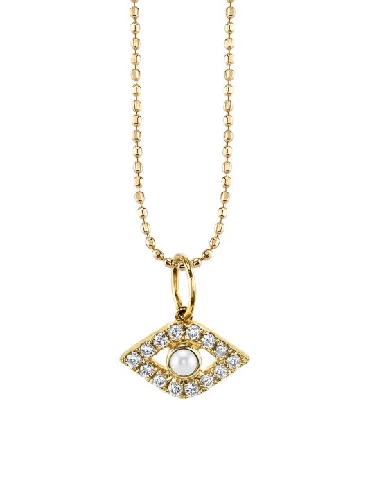 Diamond jeweled evil eye pendant with a bezel-set pearl in the center suspends from a beaded chain.