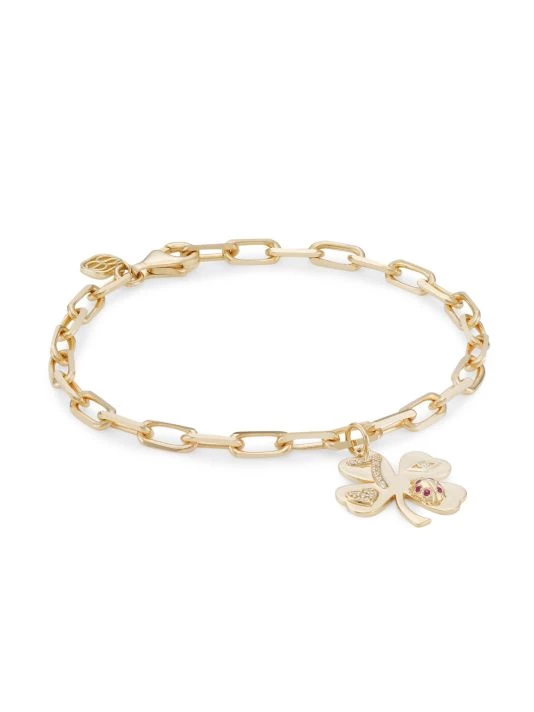 Crafted of 14K yellow gold, this striking bracelet features a four-leaf clover charm adorned with various luck motifs and embellished with sparking white diamonds and rubies.