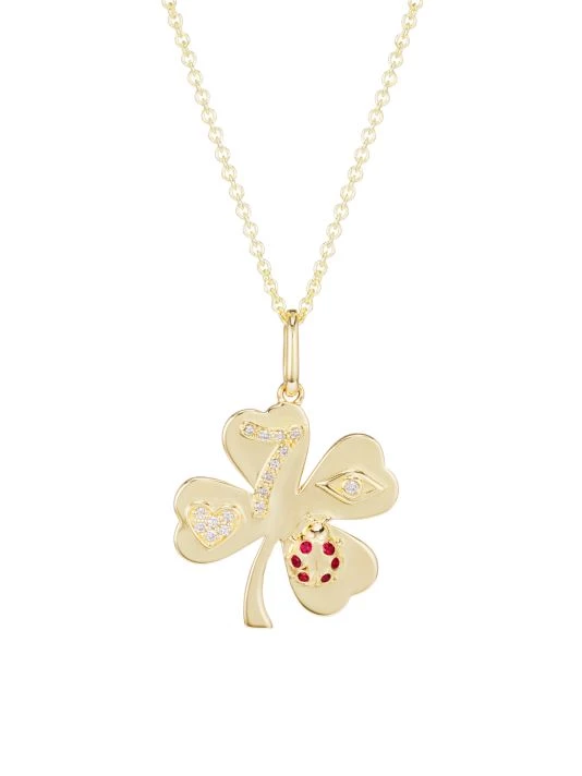 Sculpted into a clover pendant, this necklace features diamonds and rubies to add striking visuals.