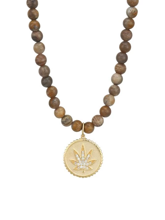 An eclectic design that combines a Mary Jane leaf gold pendant with rustic wood beads and a subtle diamond accent.