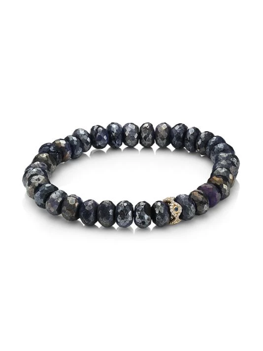Gleaming mystic blue quartz faceted bead stretch bracelet embellished with a delicate 14K yellow gold evil eye rondelle lined with 48 brilliant-cut diamonds and four sapphires.