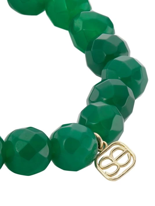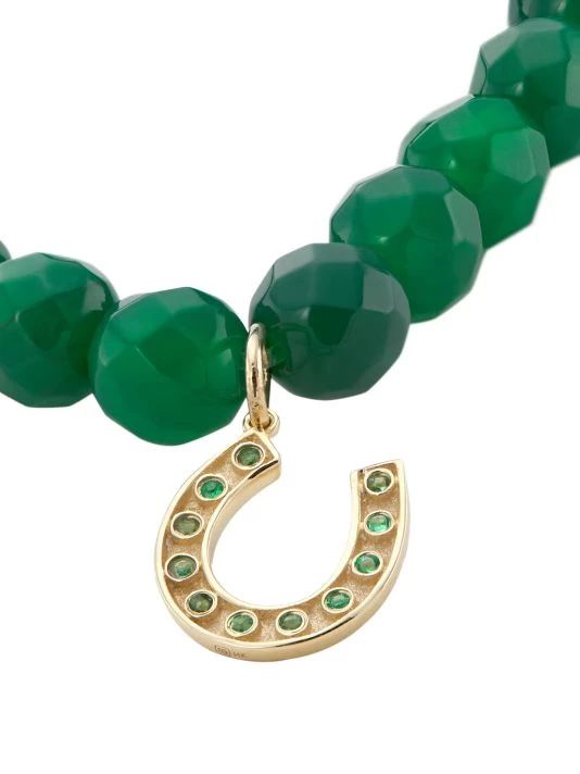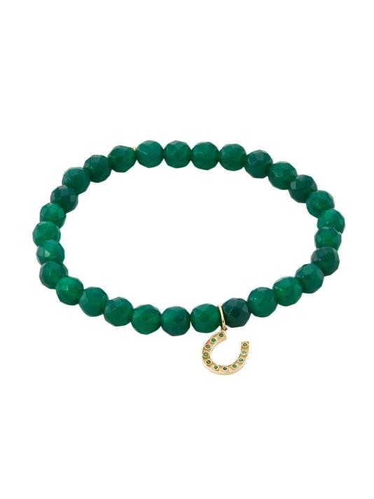 Threaded with faceted green corundum beads, Sydney Evans’ stretch bracelet features a 14K-yellow-gold horseshoe charm studded with vibrant emeralds.
