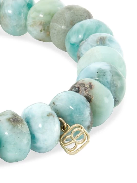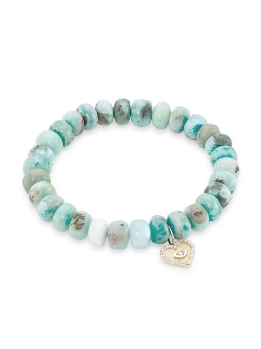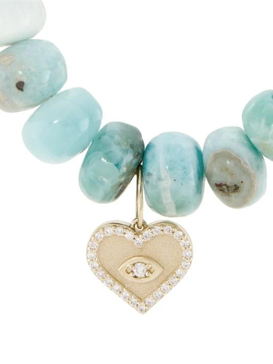 Threaded with vibrant larimar rondelles, Sydney Evan’s stretch bracelet is embellished with a diamond-encrusted 14K-yellow-gold heart charm centered by an evil-eye motif.