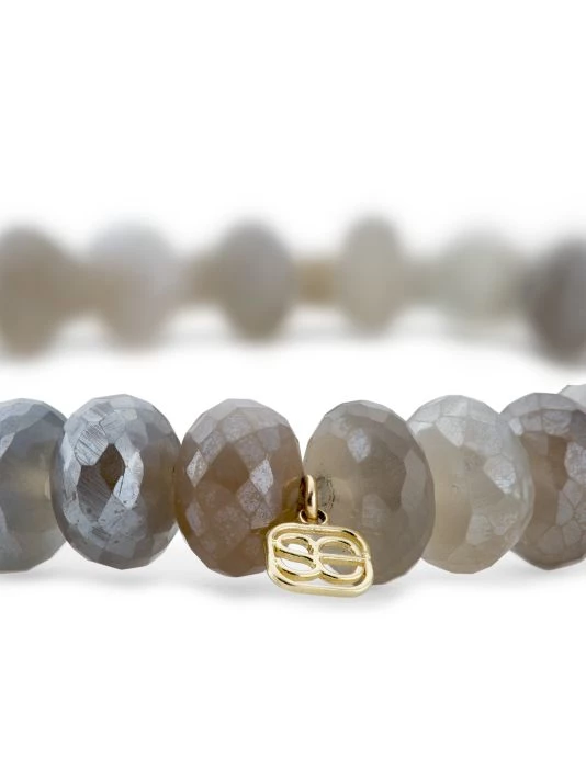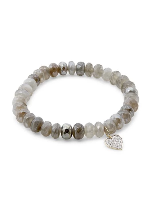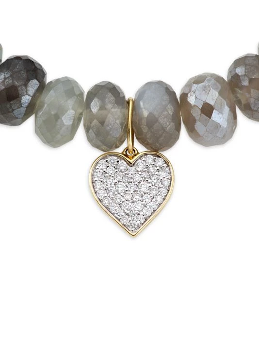 Threaded with faceted mystic grey moonstone rondelles, Sydney Evan’s stretch bracelet features a 14K-yellow-gold heart charm encrusted with sparkling white diamonds.