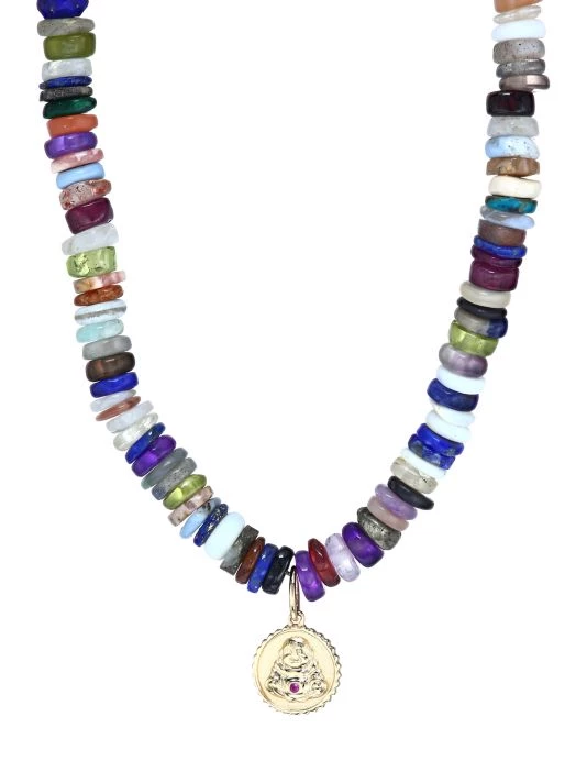 Slim collar necklace crafted of multicolor opal beads is accented with a 14K gold Buddah pendant dotted with a single sparkling ruby.